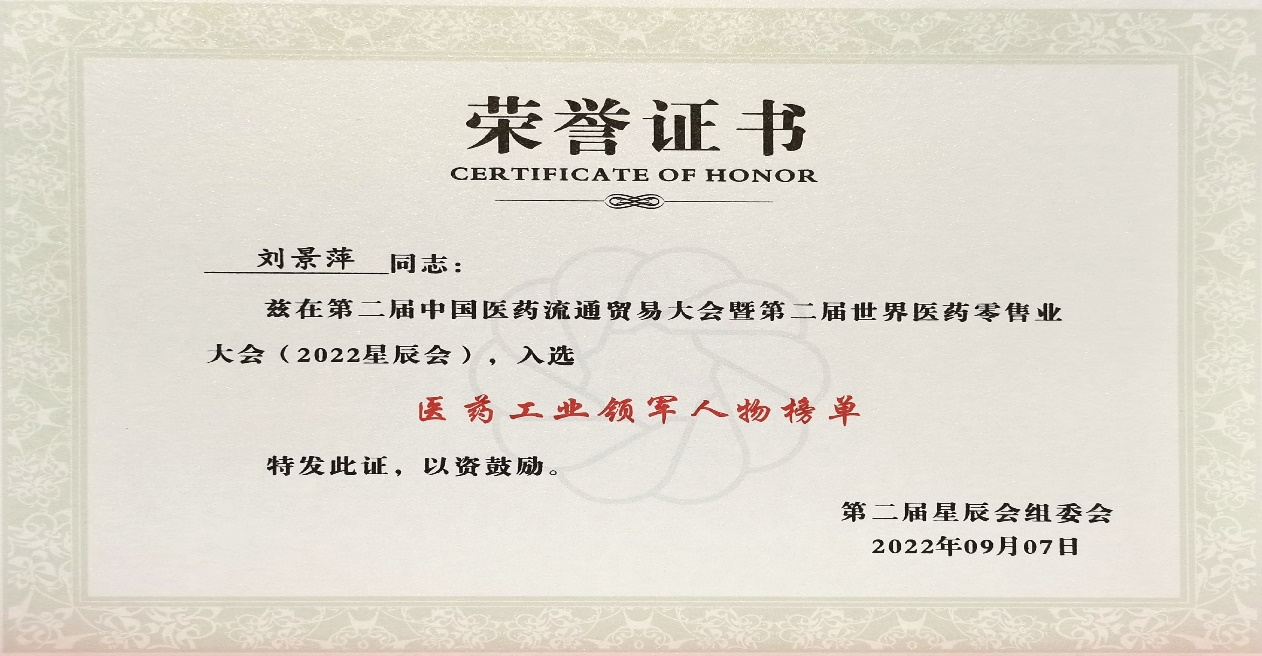 本次星辰会期间,大红鹰dhy8866斩获颇丰,获得多项行业奖项及荣誉。在开幕式上,刘景萍董事长荣获“医药工业领军人物”称号。